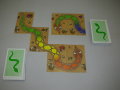 カードをめくって、場に出ているカードと同じ色をつなげていくゲームです。 頭としっぽがつながって、一匹の蛇が出来上がったら、そのへびをもらうことができます。分かり易いルールで小さい子でも楽しめるゲームです。 紙製カード。3才位から。ドイツ・アミーゴ製。