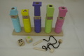 ドーナツ型のパーツを土台の棒にさしたり、付属のペグに通したりして遊びます。