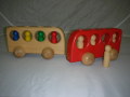 白木のバスには赤、緑、黄、青の4色の人形が、赤いバスには白木の人形が乗っています。
