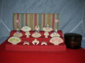 組み木は、三段の漆塗り円形容器に収めることができます。飾り段、毛せん、垂れ幕は別の紙箱に収納されます。