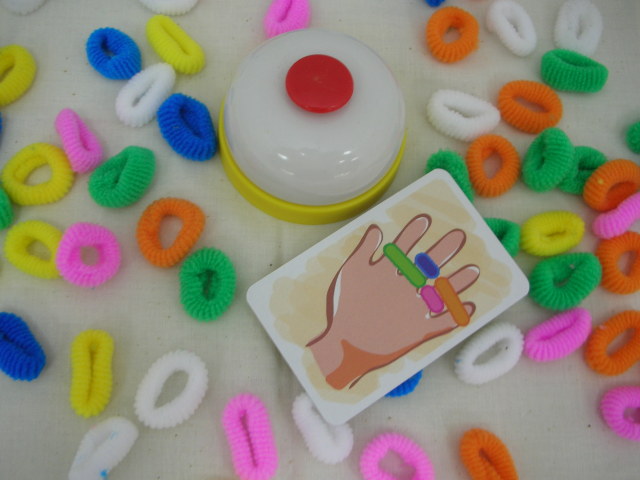 カードに描かれた色と指の組み合わせ通りに、自分の指に素早くゴムをかけるスピードゲーム。出来上がったらベルを鳴らすのはハリガリと同じですが、手と目を連動させる分、ちょっと難易度は高いかも。